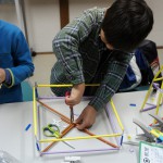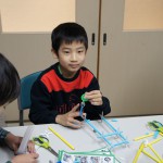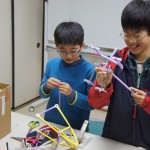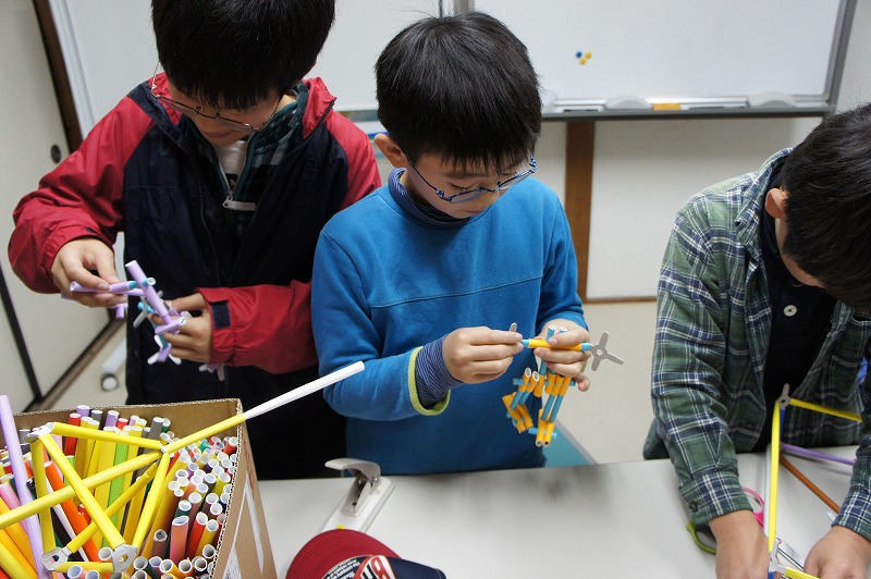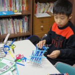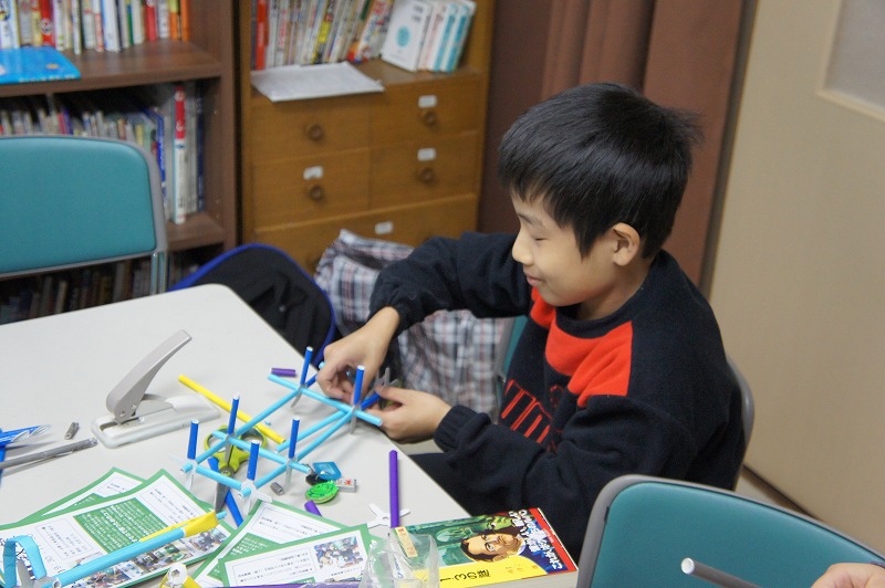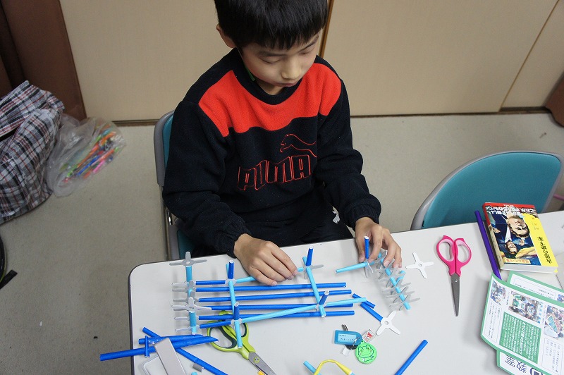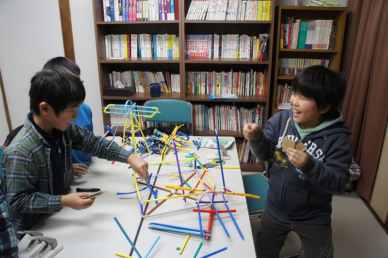 特筆すべきは、小学生が自分たちで考えた「プロレス」の展開です。Y君がたくさんロボットを作って、複数を戦わせはじめたことがきっかけで、K君がプロレスを思いつきました。そして「トーナメントにエントリーするロボットを作ろう!」と、みんなに提案しました。Hu君はプロレスリングをこしらえました。そしてK君が主に率先して考えたルールでは、じゃんけんで勝つと技が決められ、2回連続で大ダメージ、3回連続で勝つと必殺技が決まって勝負あり、ということだそうです(笑)。そのためにK君の作ったじゃんけんカードが出色で、それがみんなの支持を得て、かなりのハイテンションで楽しく遊んでくれていました。こういう展開が、「物語をモノにつける」ということなのでしょうね(^^)。